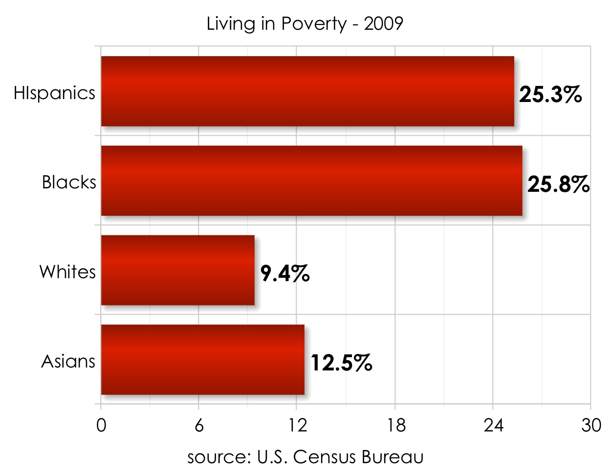According to the Institute for Research on Poverty, the poverty rate for all blacks and Hispanics remained near 30 percent during the 1980’s and mid-1990’s. Subsequently, the percentage began to fall. In 2000, the rate for blacks dropped to 22.1 percent and for Hispanics to 21.2 percent. This was the lowest for both groups since the United States began measuring poverty. Since 2009 the poverty rate for both of these groups has risen to 25 percent or more.