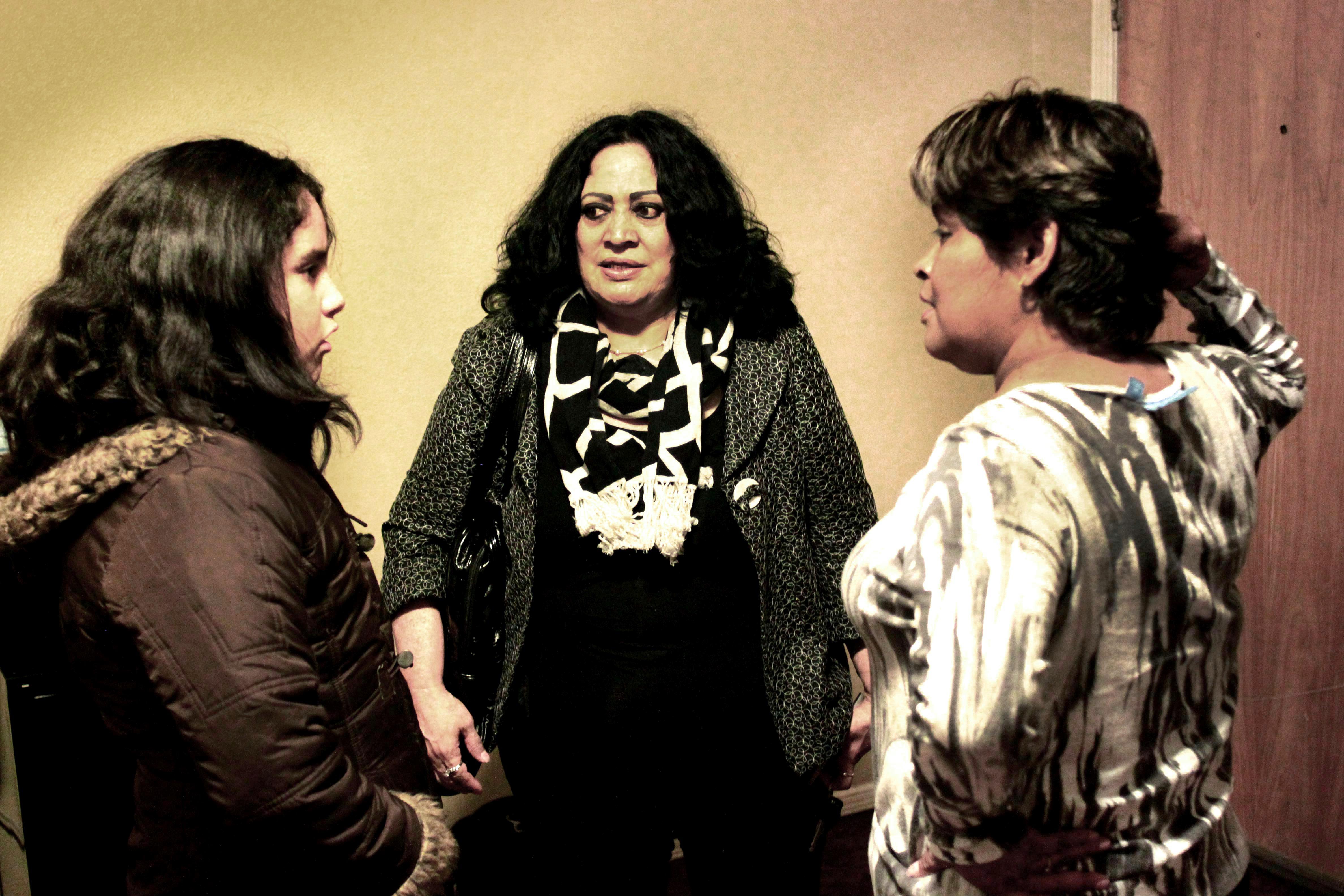 (From left to right) Isabel (daughter of Cipriana Jurado Herrera), Marisela Ortiz and Cipriana Jurado Herrera stand in a motel room in El Paso, Texas, on Nov. 21, 2013, talking about Ciudad Juárez. Luis Rivas / El Nuevo Sol.