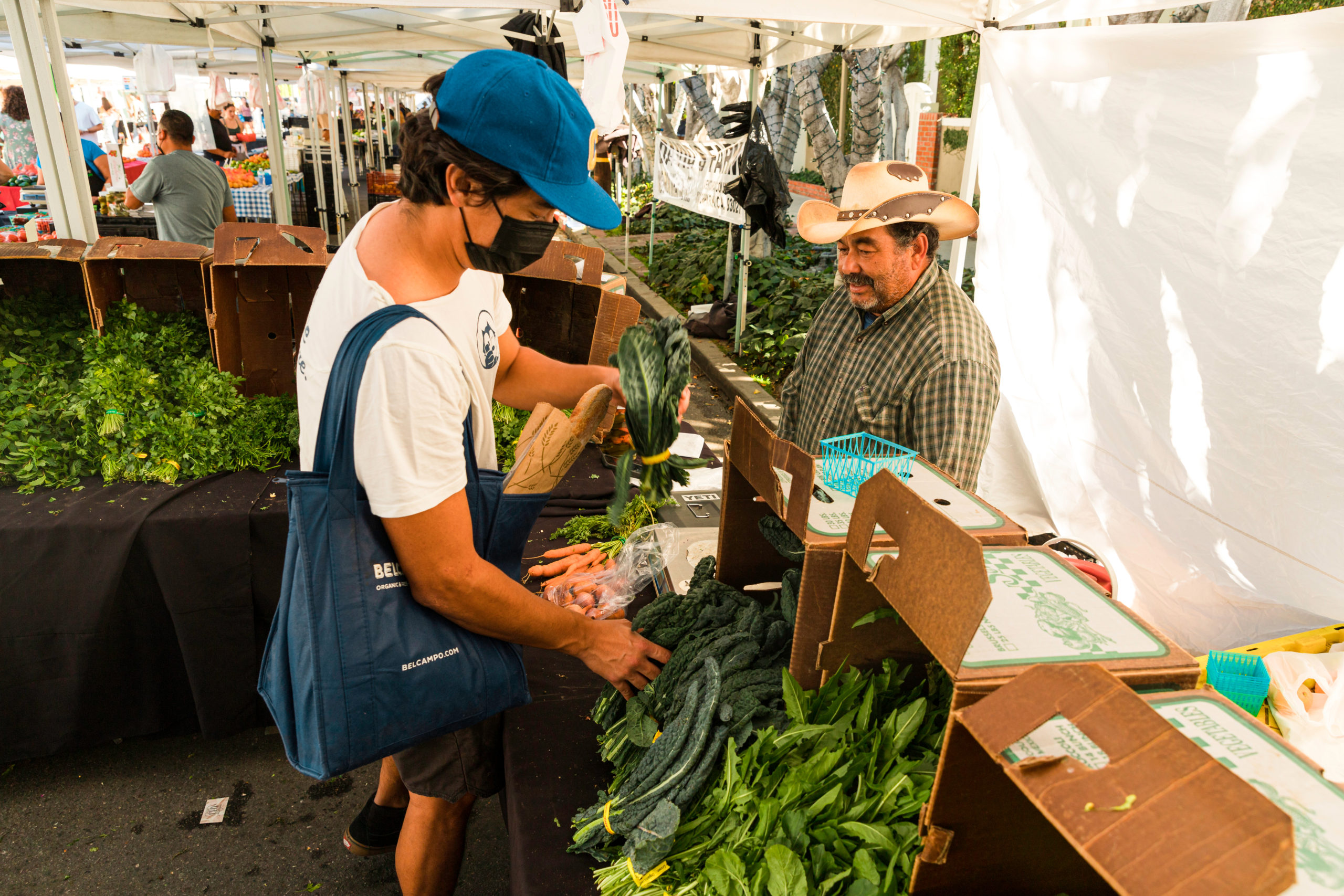 - Ricardo Montez, left, buys organic kale from José Alcántar, the founder of Alcantar Organics at the Melrose Farmers Market in Hollywood, Calif., on Sunday, Nov. 15, 2021.