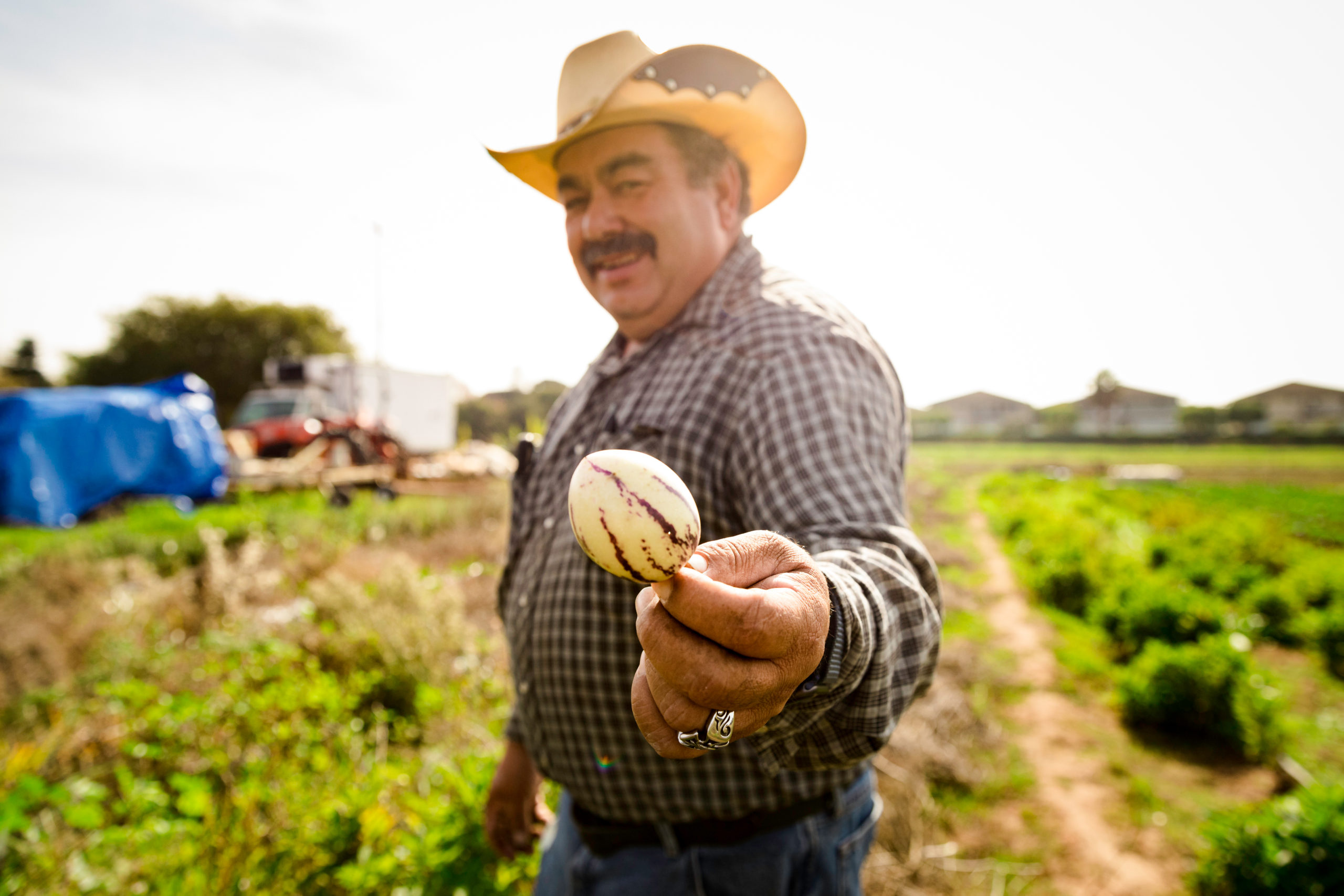 - José Alcántar, owner of Alcantar Organics, holds a freshly picked pepino melon at his family farm in Carpinteria, Calif., on Wednesday, Nov. 17, 2021. Alcántar immigrated to California from Mexico in 1992 and began as a field worker for Tutti Frutti Farms. After working in both the restaurant and grocery store business, he said he settled working in the farm business because it is something he enjoys. “There is a lot of opportunities in this country,” Alcántar said. “It’s just harder coming from Mexico and trying to live a good life here, but you have to work hard and now I am here.”