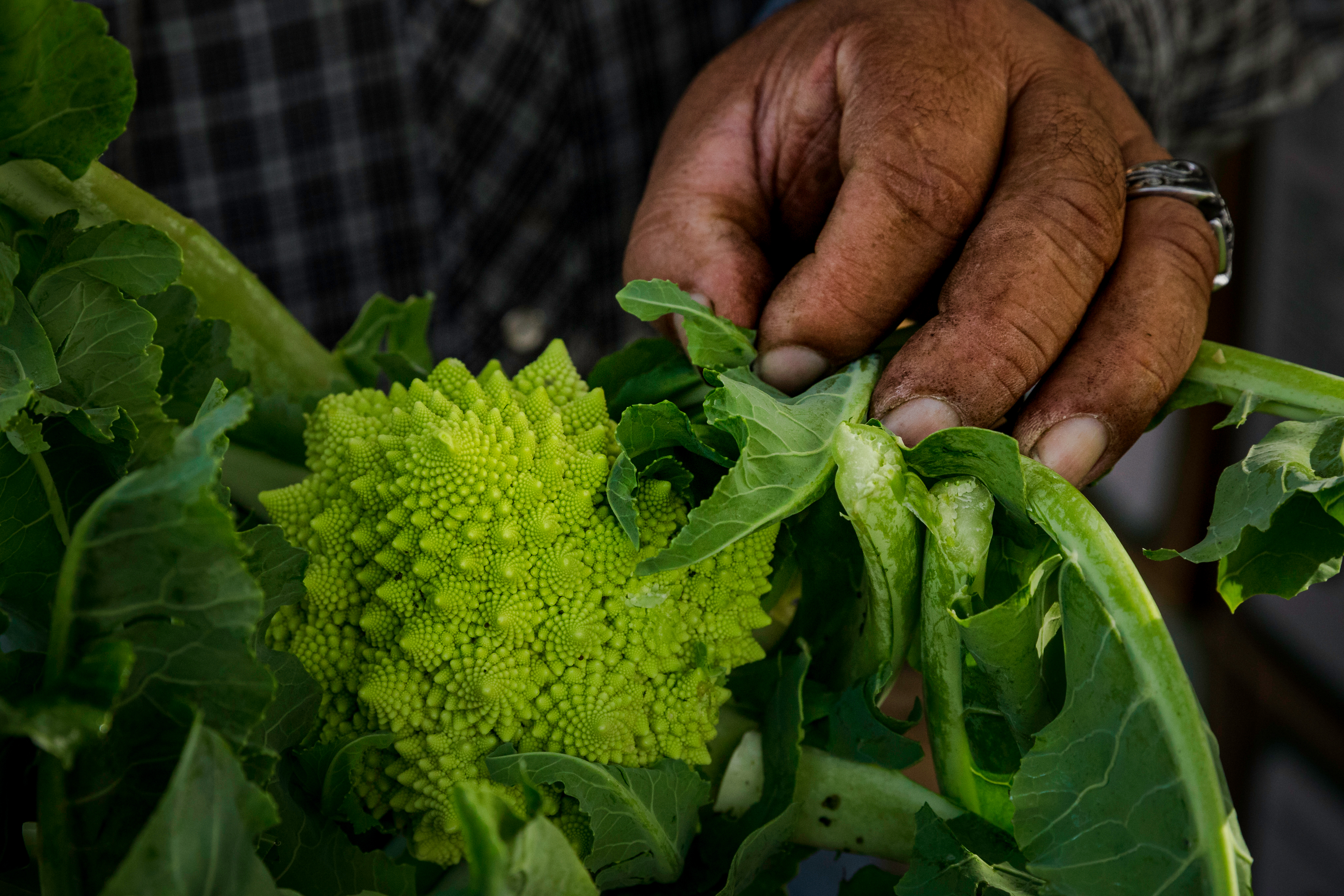 - José Alcántar, owner of Alcantar Organics, holds a freshly picked green cauliflower before packing it in a box and heading to a farmers market in Calabasas. Alcántar said his cauliflower is one of his best sellers at his farmers markets, but cauliflower takes a lot of water to grow in large amounts. “It takes a lot of water, but I have no choice but to grow because my customers love it, “said Alcántar when asked about how popular his cauliflower is.