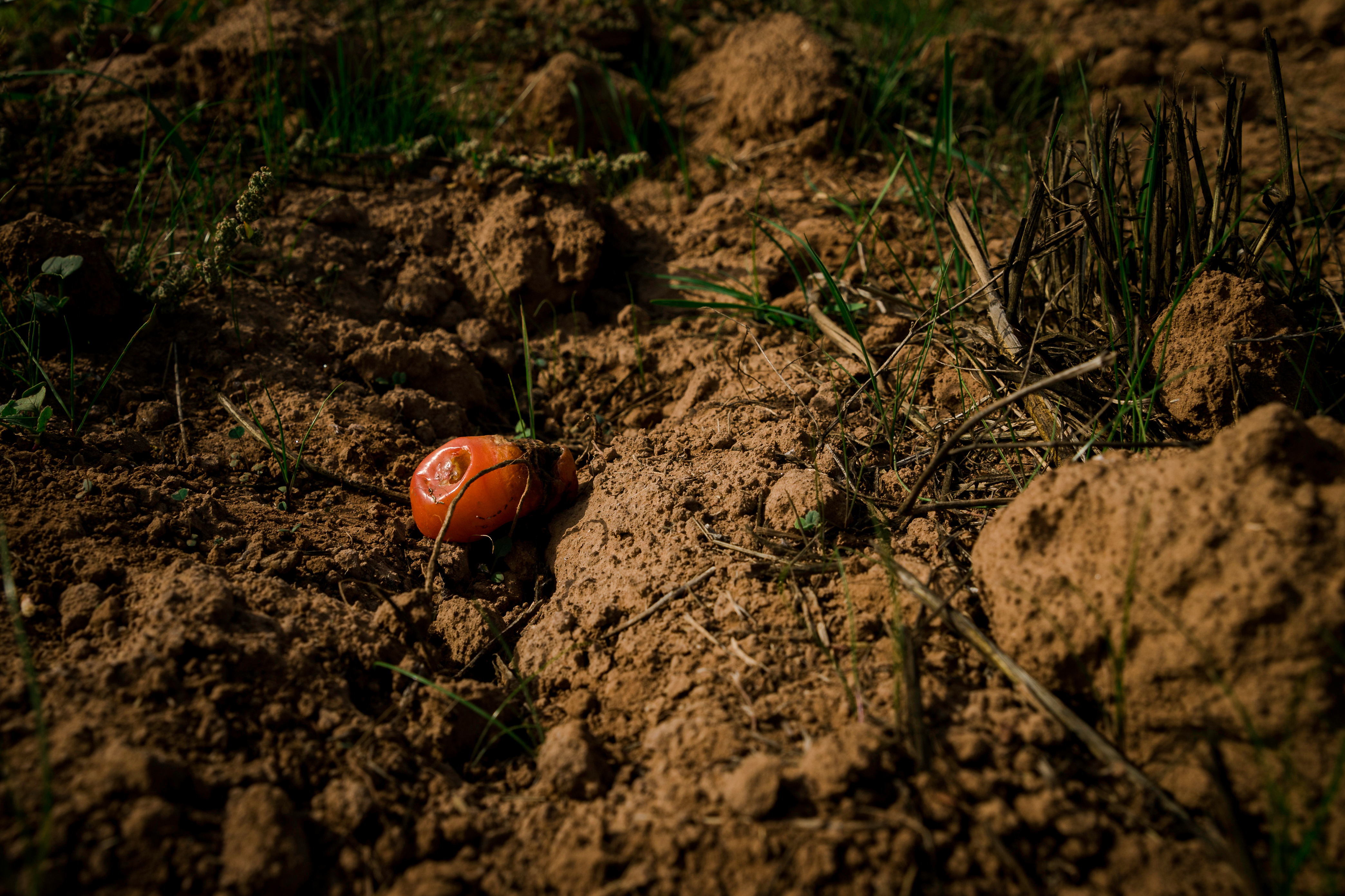 - A rotten, dried tomato is thrown in the dry area where Alcantar would normally plant lettuce and cabbage at his family farm in Carpinteria, Calif., on Wednesday, Nov. 17, 2021. With this large patch of soil being too dry, Alcantar was forced to use this area as an organic dump to cultivate compost. “When there is no rain, its hard to grow anything,” Alcantar said. “Paying for water is too much so we made dry areas on purpose to save money.”