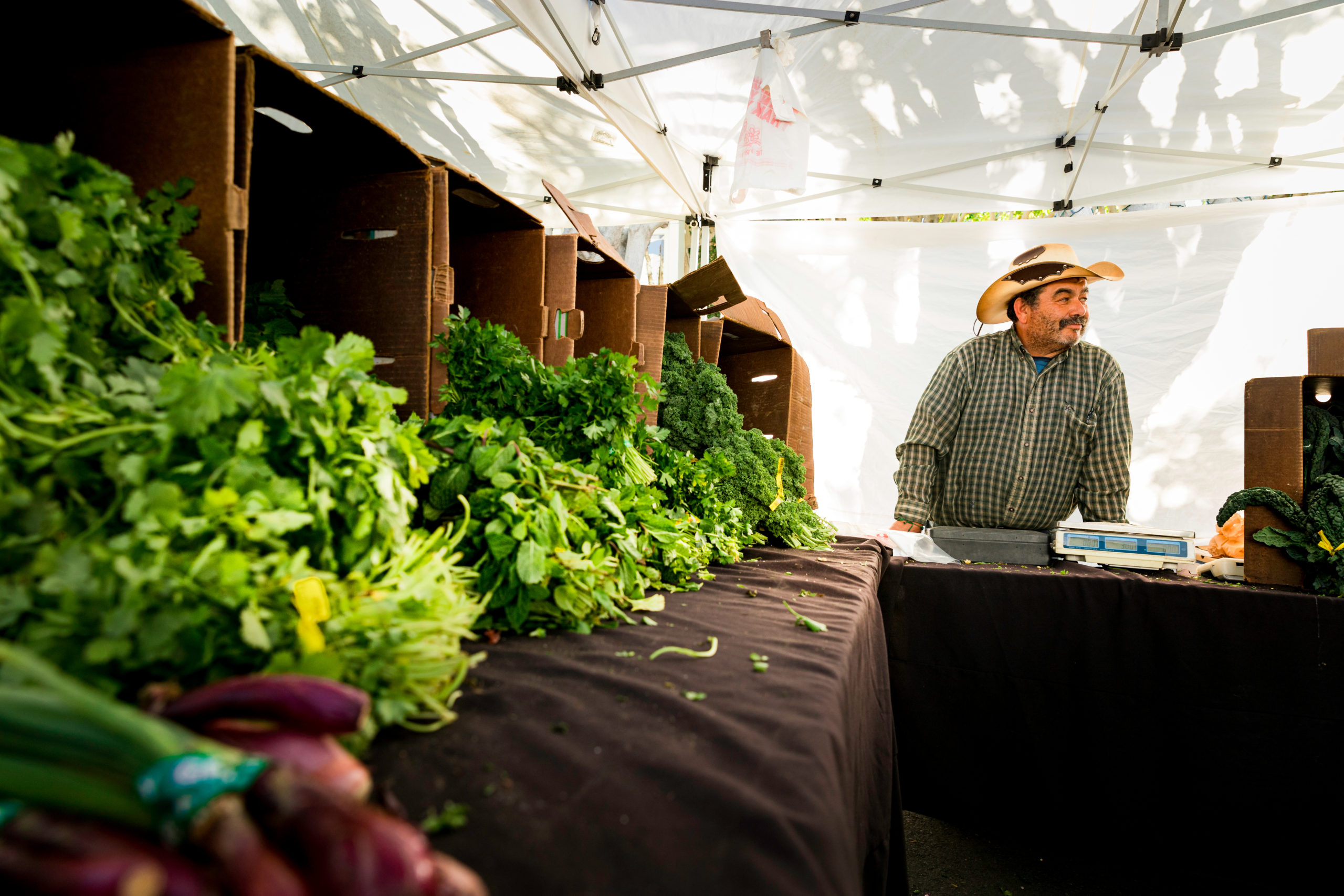 - José Alcántar, owner of Alcantar Organics, waits for customers at the Alcantar Organics stand at the Melrose Farmers Market in Melrose, Calif., on Sunday, Nov. 14, 2021. Alcántar said he serves about 200 to 300 people at the Melrose Farmers Market. From Friday to Tuesday, Alcantar will go to farmers markets in Ojai, Santa Barbara, Calabasas, Melrose and Oxnard.
