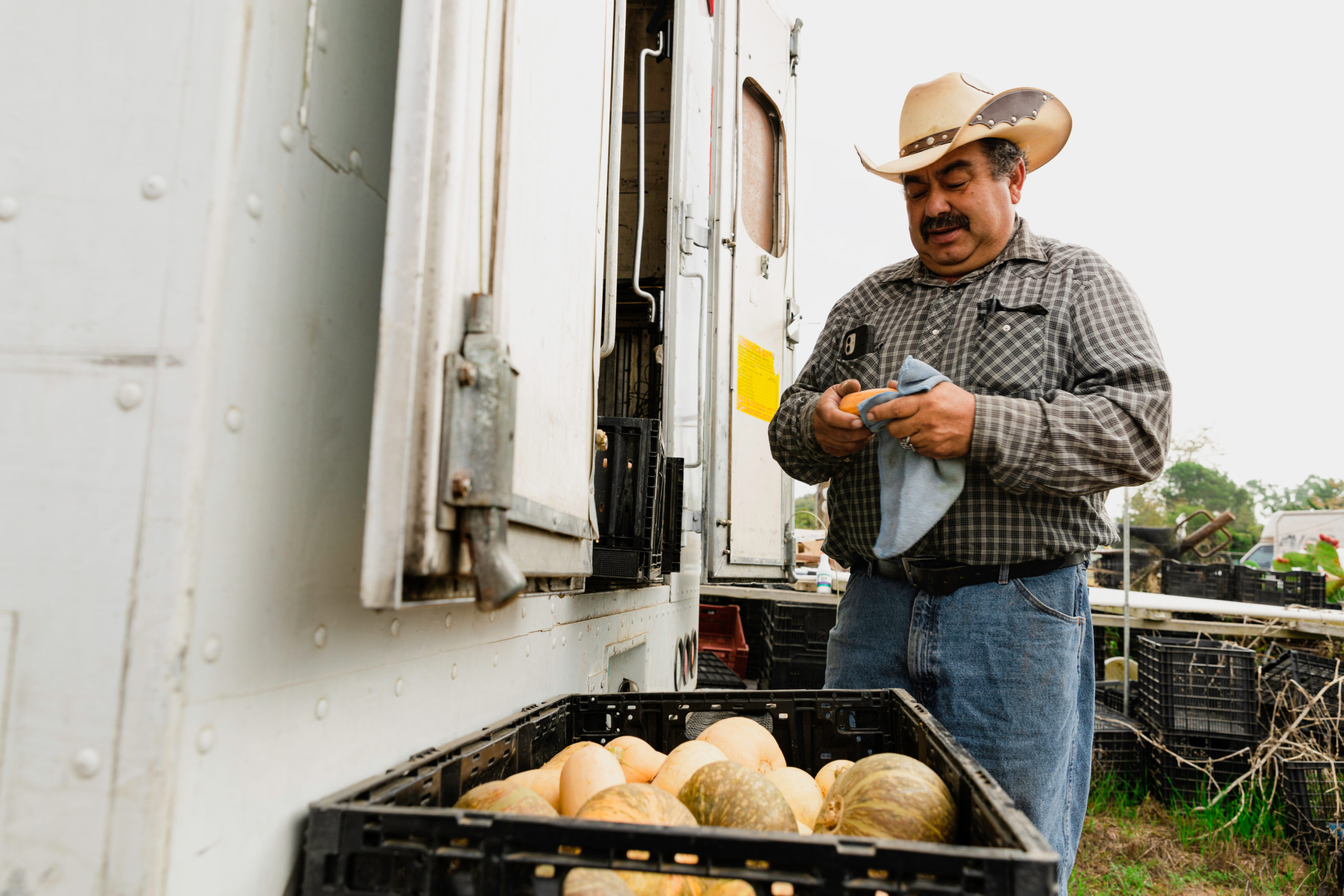 - José Alcántar, owner of Alcantar Organics, cleans a crate full of small butternut squashes at his farm in Carpinteria, Calif., on Wednesday, Nov. 17, 2021. Alcántar said he inspects every singular vegetable and fruit to see if it meets his own standards. If it does not, he throws it away. “Without a lot of rain, my crops sometimes dry out early,” Alcántar said. “I’ve been throwing out more products lately. I dont like it.”